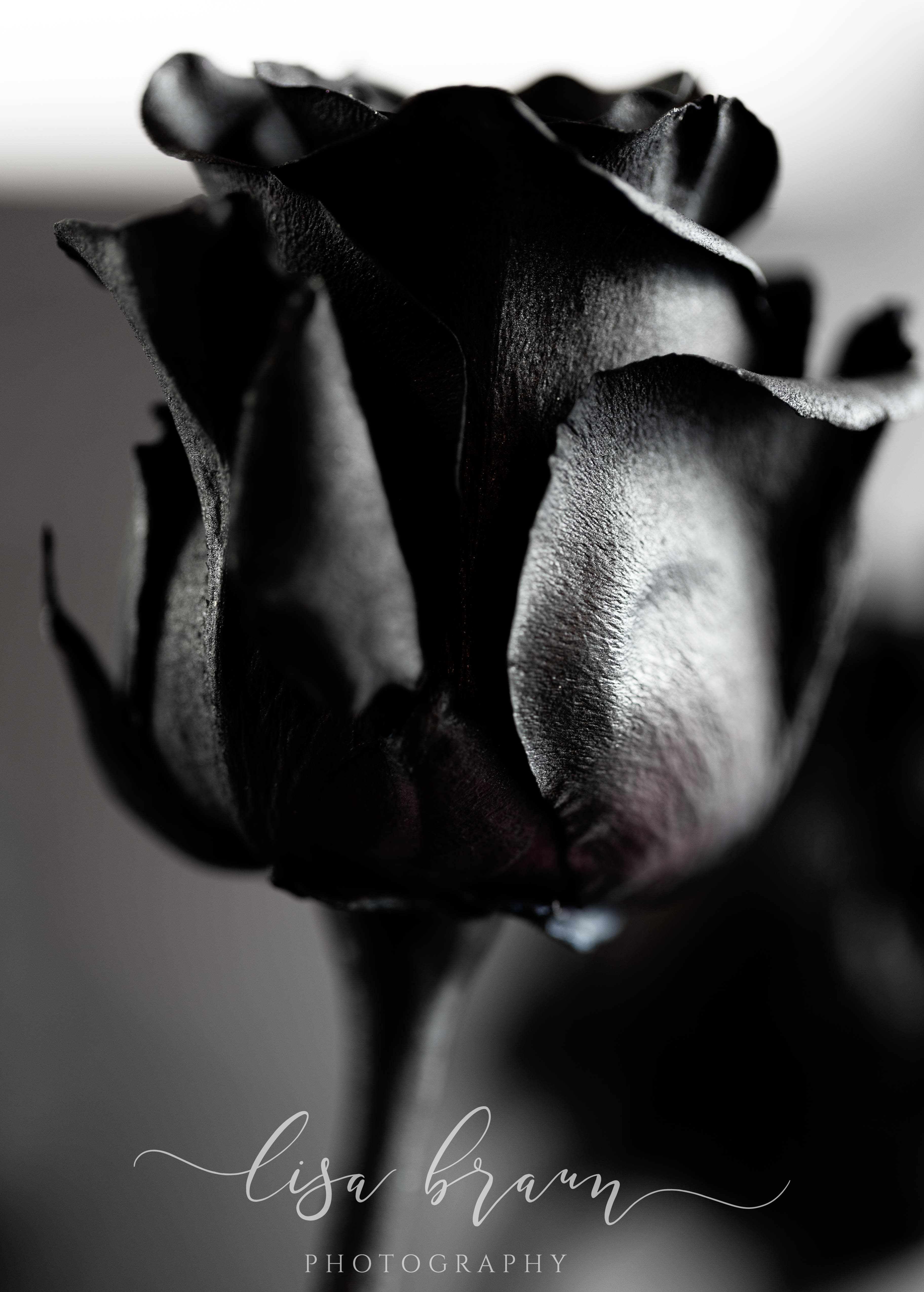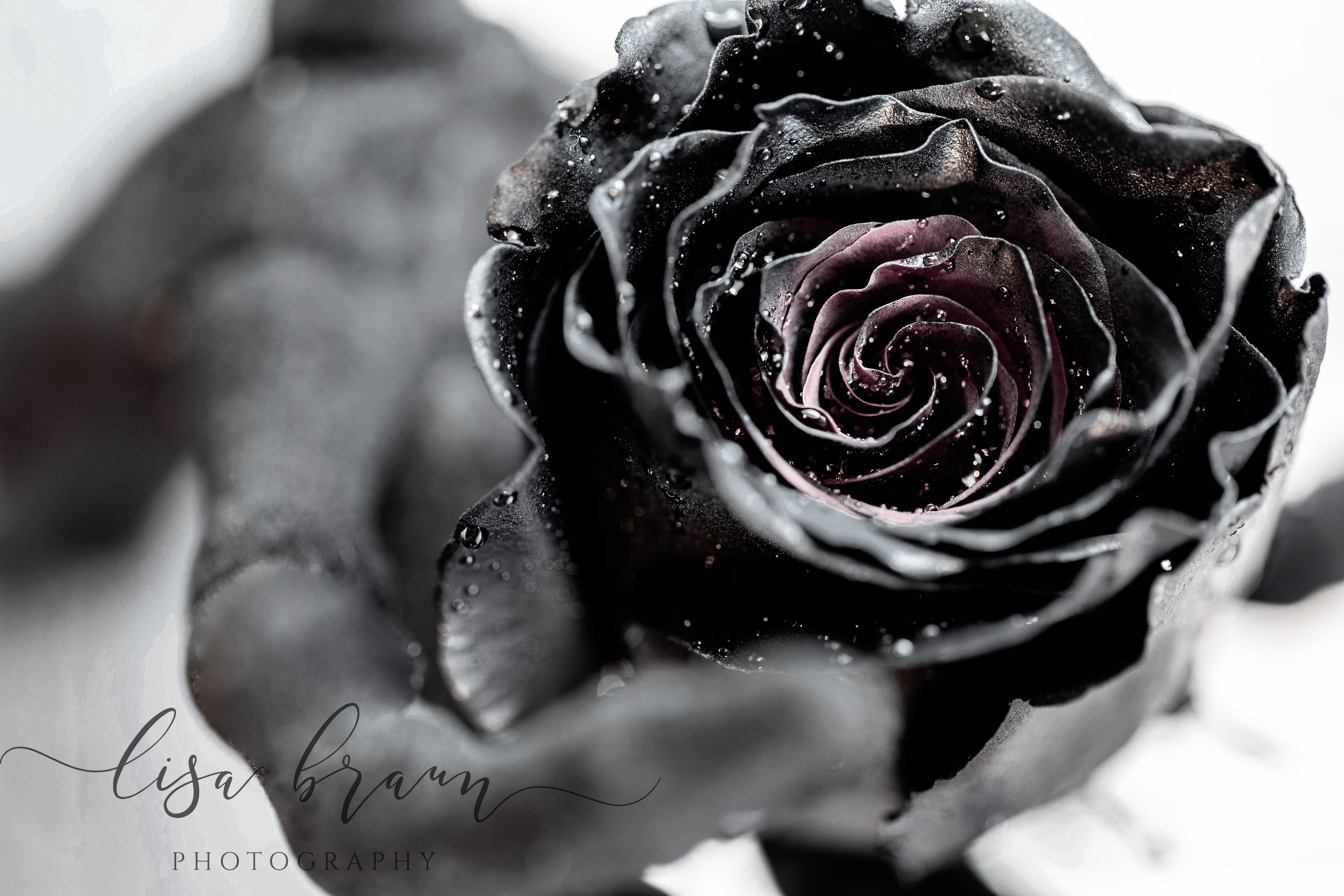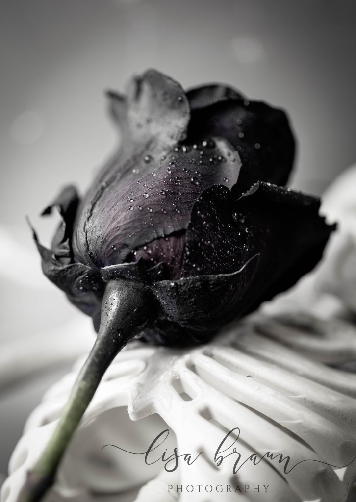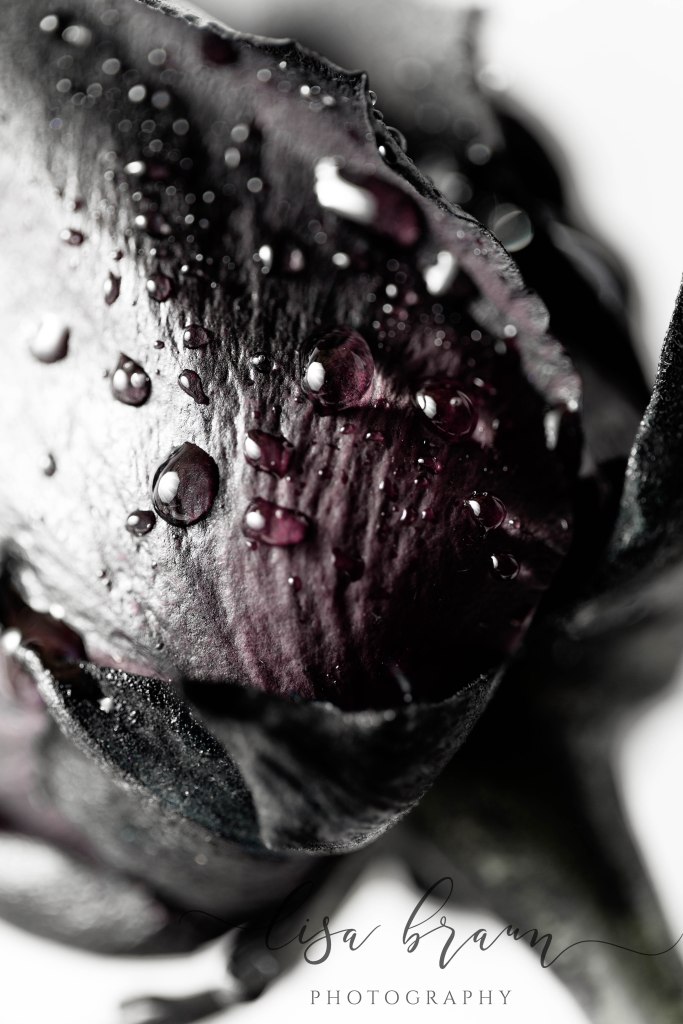 Although disappointed, I was determined to find an alternative, so I began searching the internet for ideas. Eventually I found a highly rated online supplier that grows premium red roses, and by using a solution in the water, it dyes the roses black. As you can see from the images, each one is a bit unique, and they do project a deeply saturated black on the outside, however it wasn’t until photographing them that I noticed the middle reflected a completely different hue. Before I artistically enhanced them, the color was indeed more red, however during the editing process I chose to bring out the more purple tones for less of a contrast. Aside from black after all, purple is my favorite color, and it gave the roses more of a look that appealed to me. (Don’t you love the artistic freedom that editing brings?)