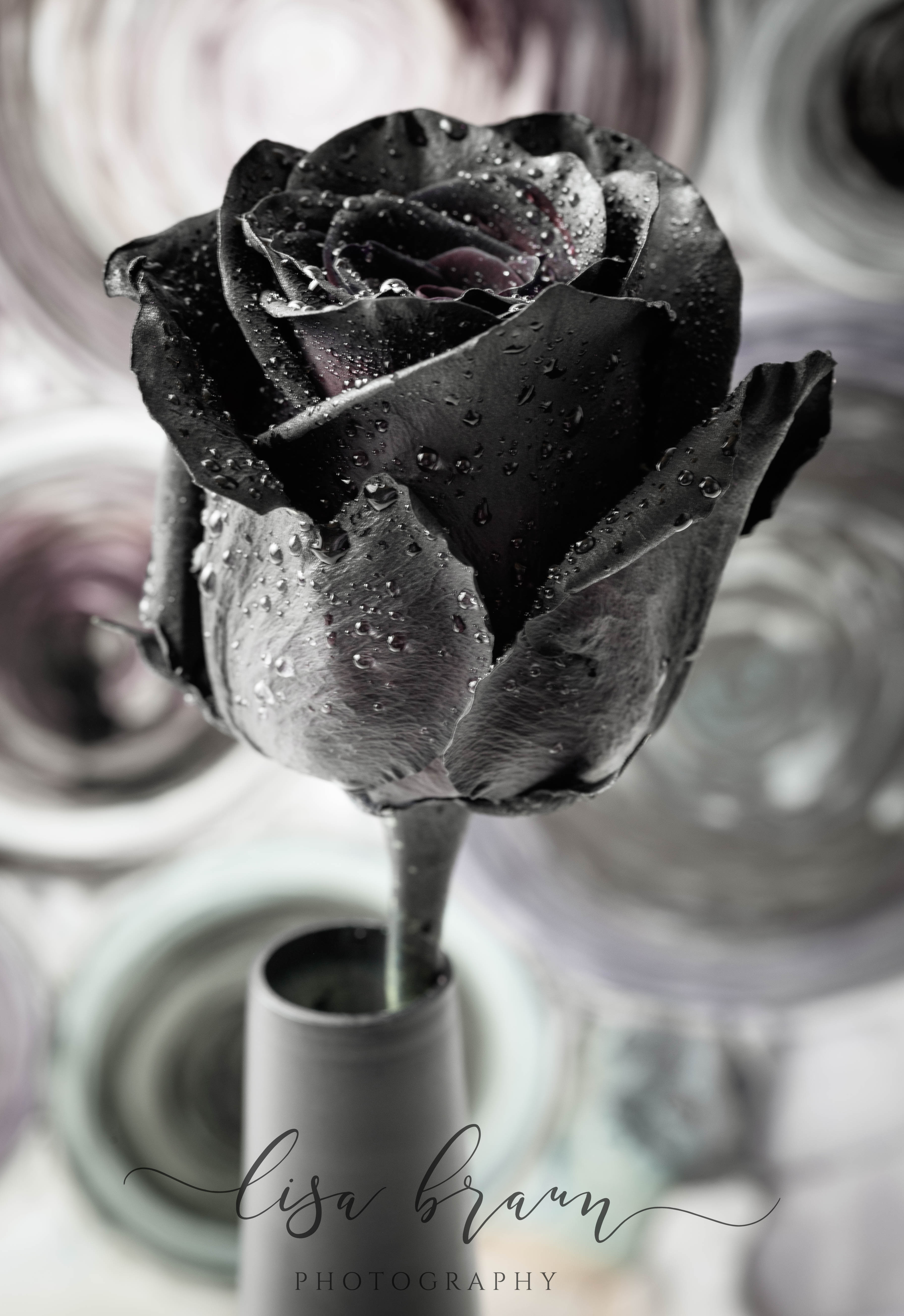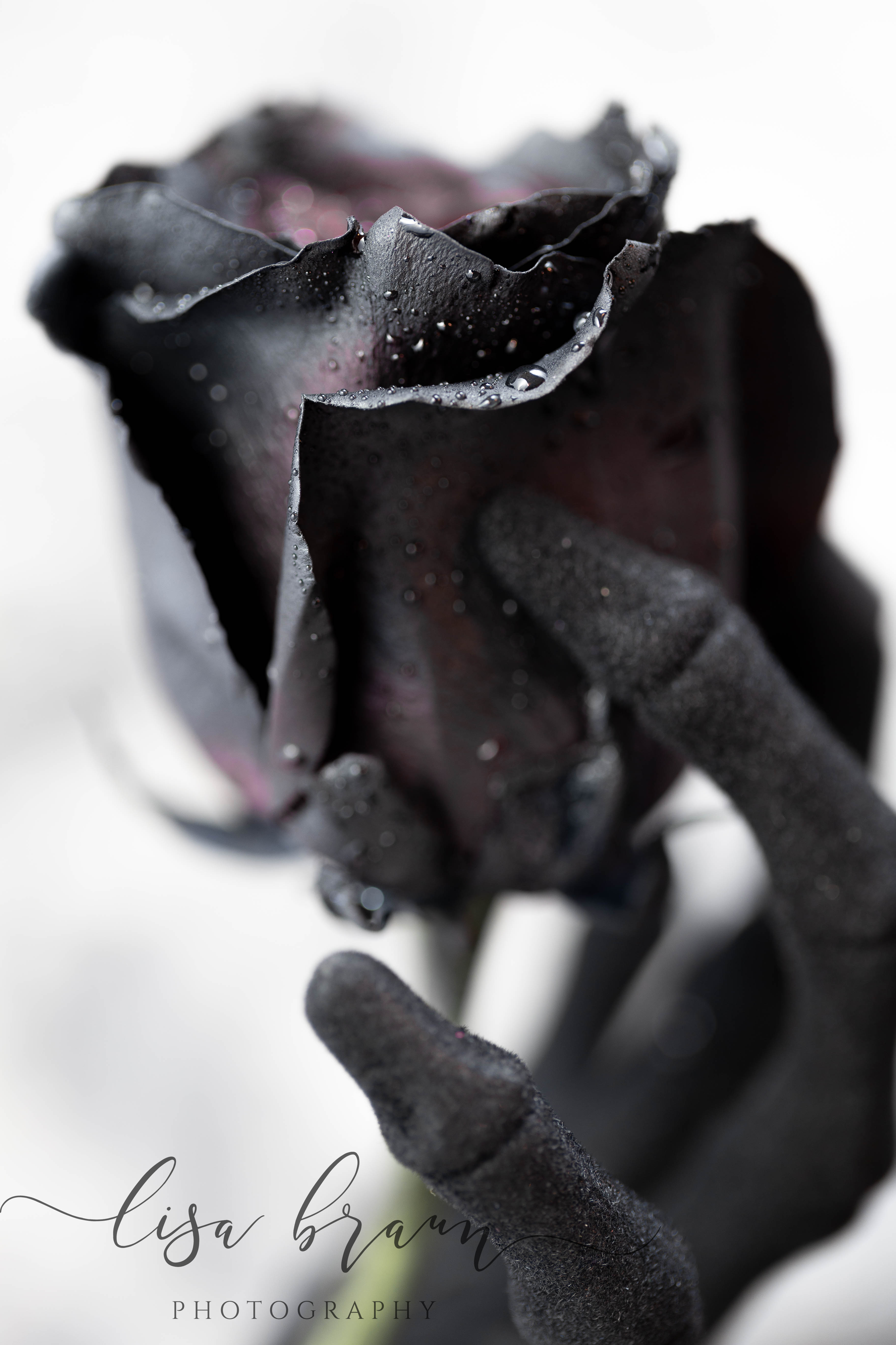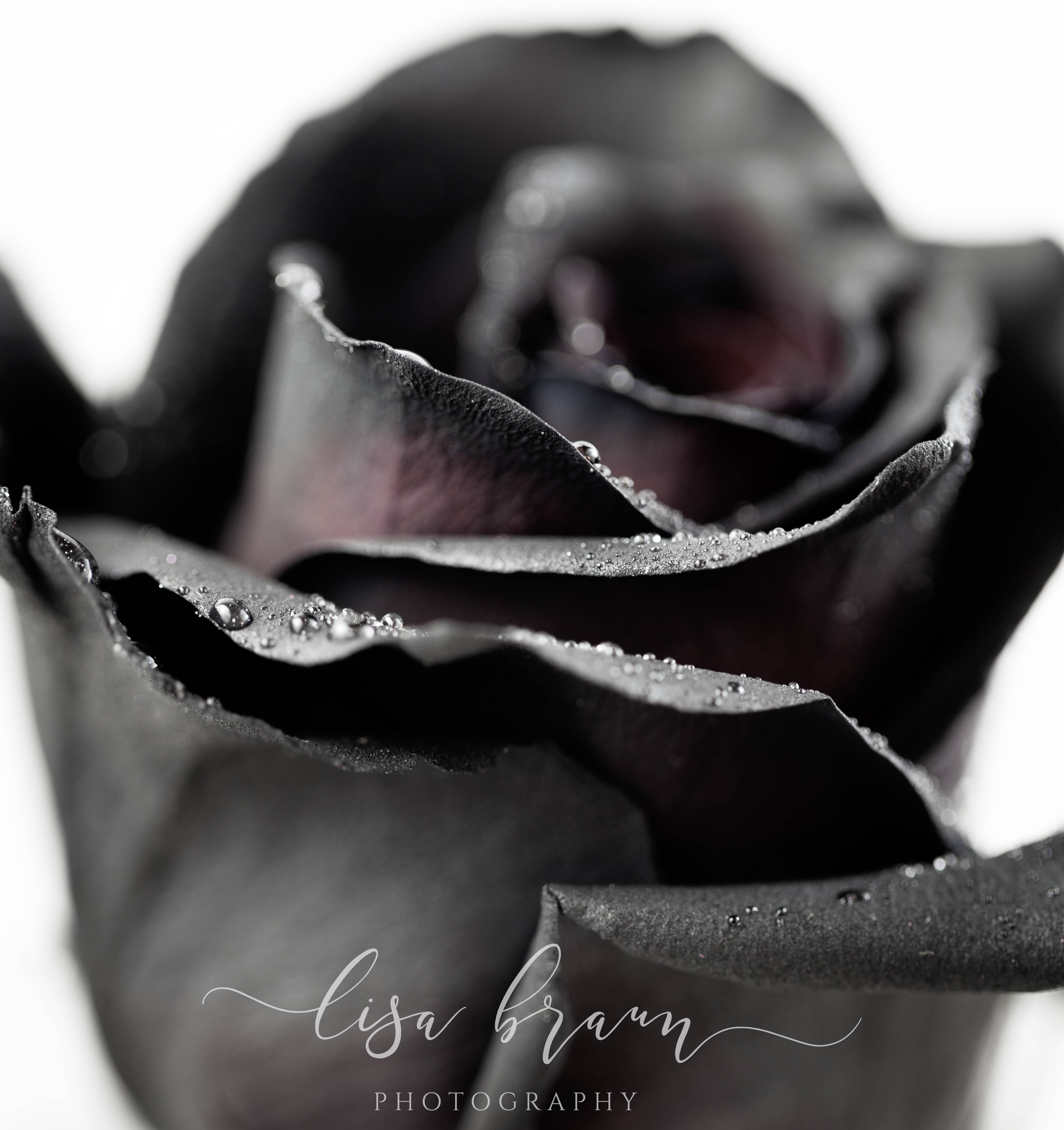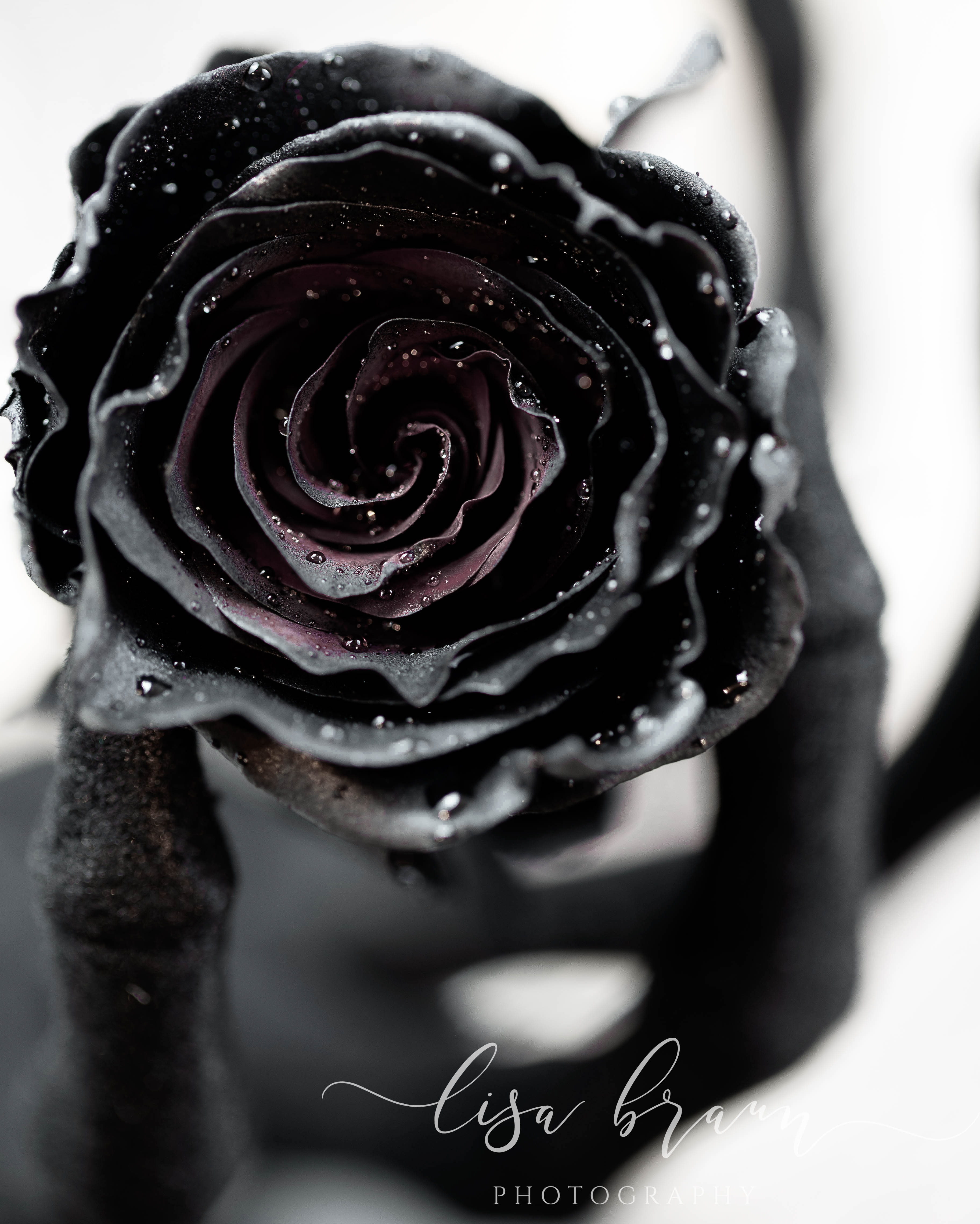Although disappointed, I was determined to find an alternative, so I began searching the internet for ideas. Eventually I found a highly rated online supplier that grows premium red roses, and by using a solution in the water, it dyes the roses black. As you can see from the images, each one is a bit unique, and they do project a deeply saturated black on the outside, however it wasn’t until photographing them that I noticed the middle reflected a completely different hue. Before I artistically enhanced them, the color was indeed more red, however during the editing process I chose to bring out the more purple tones for less of a contrast. Aside from black after all, purple is my favorite color, and it gave the roses more of a look that appealed to me. (Don’t you love the artistic freedom that editing brings?)
